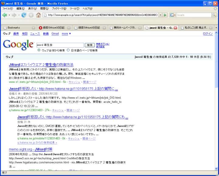 「jword 寄生虫」でGoogle1位を獲得。JWordとはActive Xを悪用して勝手にインストールを迫る迷惑ソフトの1つ。ウイルスにも似ているが、趣味よりも商業活動としてやっている様子から、スパイウエアと称される事が多い。