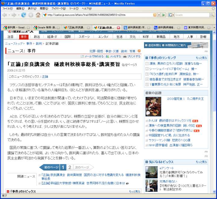 先ずMSN産経の「暴論」から。樋渡利秋検事総長の講演のまとめだが、裁判員制度を推進するに足る意見とは到底、思えない。