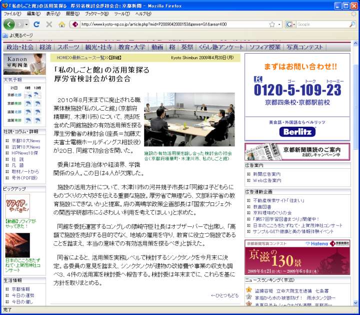 京都新聞は「私のしごと館に係る建物等の有効活用検討会」が開催された事に触れている。その目的は2010年8月末迄に廃止される事になった「私のしごと館」の活用策を、地元の視点から探る為。委員は「私のしごと館のあり方検討会」に参加していた2名と自治体関係者等。何れ詳しい議事録が出るだろうが、今コメント出来る点として木津川市市長·河井規子の発言