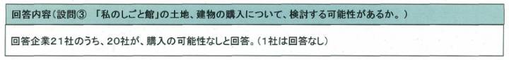 20日に開催された「私のしごと館に係る建物等の有効活用検討会」で議論の叩き台となった資料が公開されている。場所はwww.mhlw.go.jp/shingi/2009/04/s0420-8.htmlだ。その中で目を惹くのは、今後の有効活用に関するアンケート(資料5)。関西企業103社の約1/5、21社が回答しており、その中には農業·バイオの実験場と云うユニークな意見もある。だが極め付けは最後の、購入の可能性。21社中、20社が「ない」との事。これが現実だ。有効活用の途を探す実務はこれからシンクタンクがやる様子だが、検討会の委員も知って置くべき事がある。それは、けいはんな地区全体の開発の遅滞や、(株)けいはんなの倒産と云う厳しい事実。厚労省が作成した資料にはそうした問題には触れていない。地元を代表する委員はそんな事は初めから知っているから要らないのか。だがそうでない委員、例えば森永卓郎は「私のしごと館のあり方検討会」で、私のしごと館を宿泊機能付きの研修施設、つまり第2のけいはんなプラザにする様な能天気な意見を吐いていた。だから私のしごと館を取り巻く状況を整理する必要はやはりあるのだが、厚労省自身が知らないのか、意図的に伏せているのか。