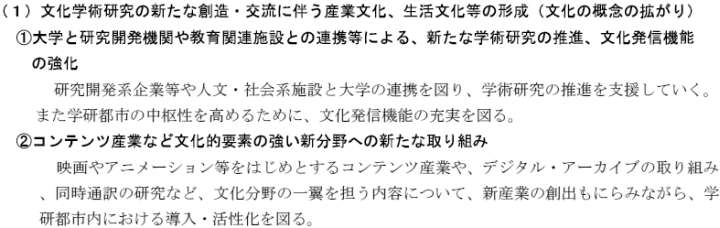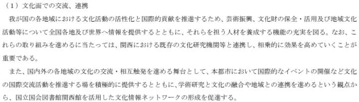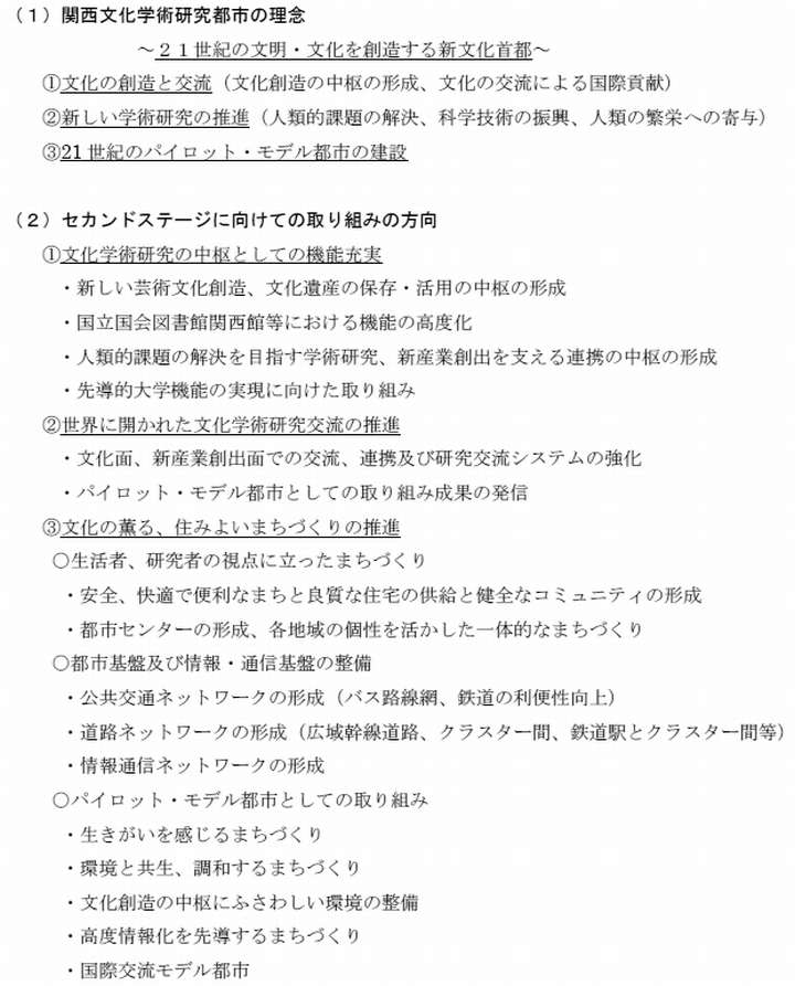 も国立国会図書館関西館や私のしごと館を文化の一部として位置づけつつ、梅棹構想への言及を避け、「芸術」という言葉をデジタル産業や地域活動に関してのみ、用いている。セカンドステージプランにあった「新しい芸術文化創造の中枢の形成」は9年の歳月を経て、産業志向が強まる中、関係省庁がノーを突き付けたのか、旗振り役に何かがあったのか、ともかく消えた事は確かだ。