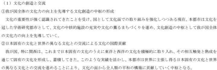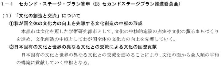 に於いて何度も「文化」と云う言葉を使っている。その中でも「新しい芸術文化創造、文化遺産の保存·活用の中枢の形成」や「文化面、新産業創出面での交流、連携及び研究交流システムの強化」は、何らかの組織や施設を作る意図を感じさせる表現だ。梅棹忠夫は総合芸術センターの博物館の側面を「ジーンバンク」と称していたが、これには「保存」や「創造」が符合する。そして