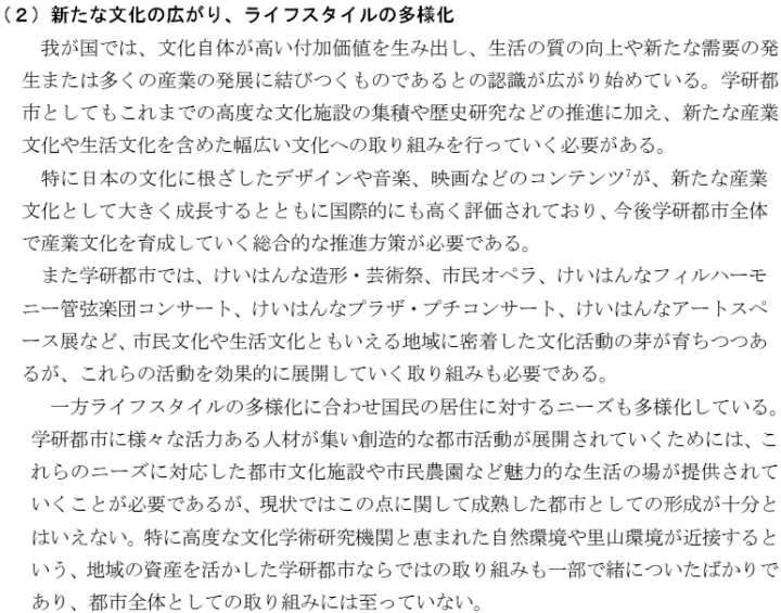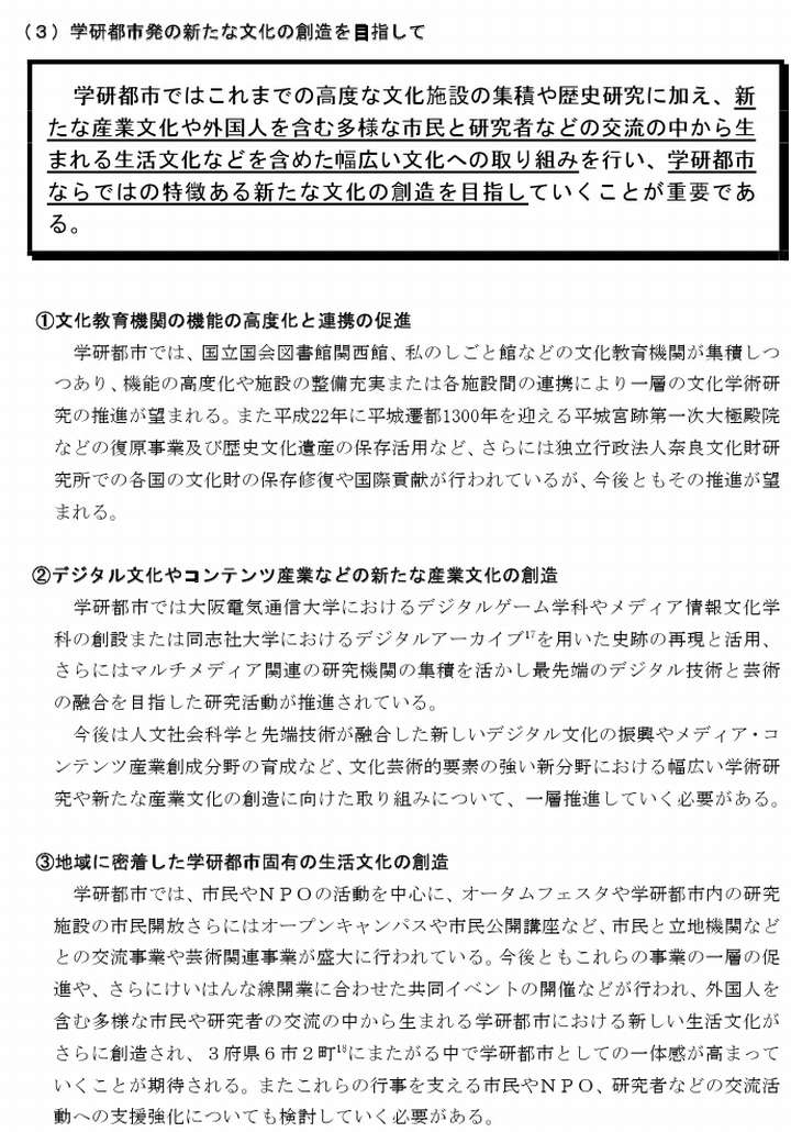 にある現状認識に於いては、コンテンツ産業の発達や地域住民の活動に関する話はある。だが「関西文化学術研究都市の明日を考える懇談会」の提言は、全体として「遅れ」「不足」「不十分」等をキーワードとしつつ、だからもっと開発が必要だ、とする発想を基調としている。にも関わらず、セカンドステージプランで明記されていた総合芸術センターの動きが全く無い事には、一切触れていない。将来展望を述べている部分