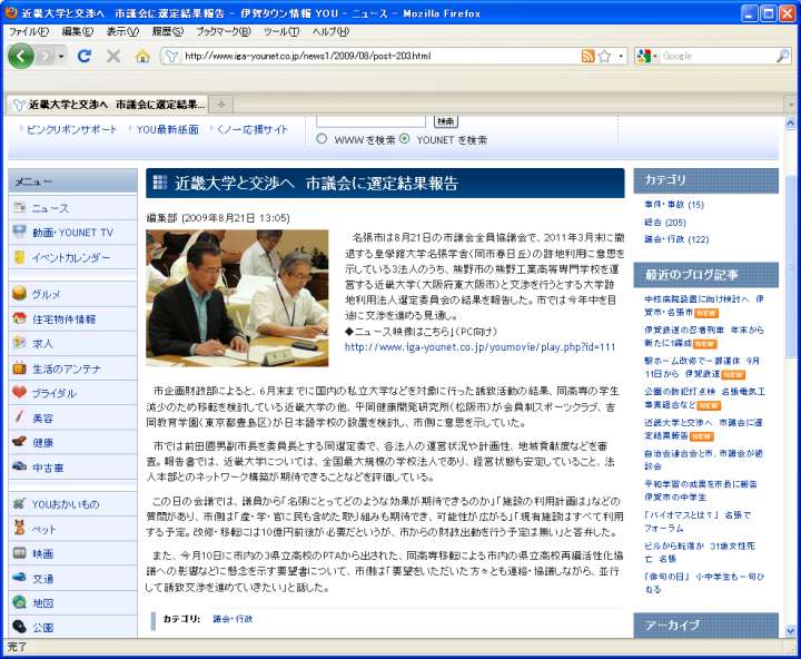 次の話題だが、地方公立大学の研究者と思われる個人のブログ(ogasawara.cocolog-nifty.com/ogasawara_blog/)を辿って見ると、どうやら三重県熊野市にある近大高専が移転を検討しているらしい(ogasawara.cocolog-nifty.com/ogasawara_blog/2009/08/post-4837.html)。要点をまとめると、