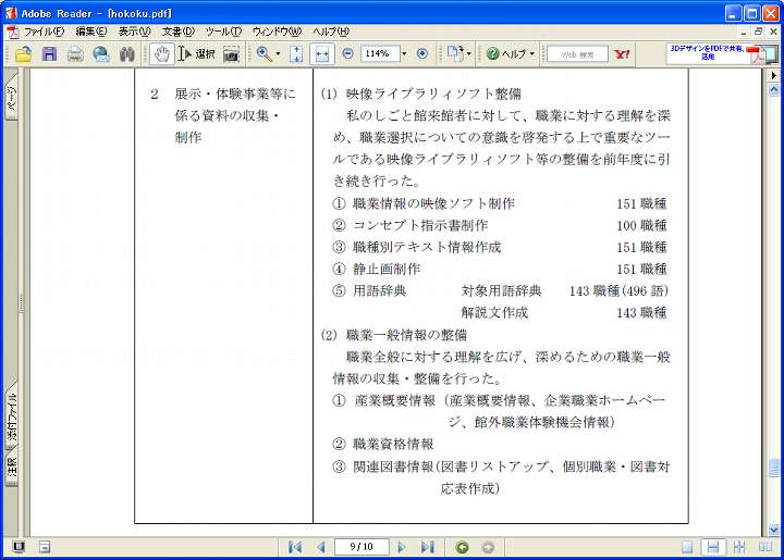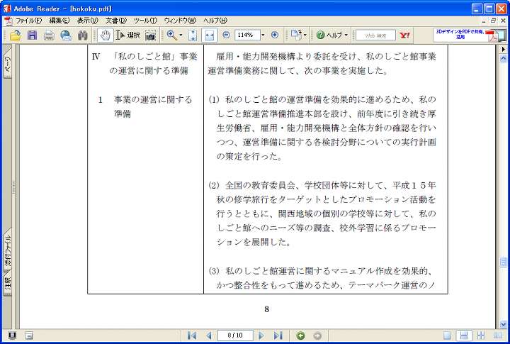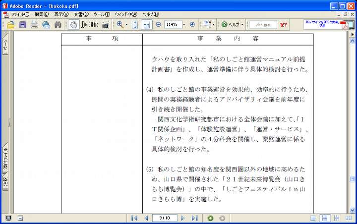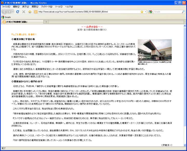 今日は晴。この日記、元々祭の写真の速報やエニアグラム·MBTIに関する考察を目的として2002年1月20日始まったが、最近では雑談日記になっている。さて掲題の私のしごと館だが、廃止が決まる以前から有効活用は悩みの種だった様子だ。例えば下に挙げた資料は関西文化学術研究都市月報2007年5月号。www.kri-p.jp/portal/geppou/img/0224.pdfからダウンロード出来る。けいはんな地区の近況報告だが、その中を引用すると、