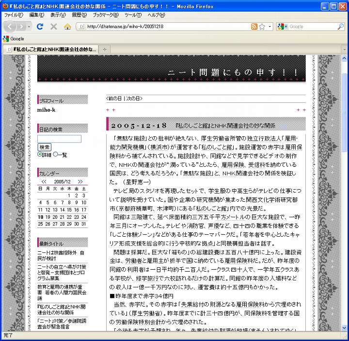 私のしごと館とNHKとの関係を批判する個人の2005年のブログ(d.hatena.ne.jp/miho-k/20051218)にも