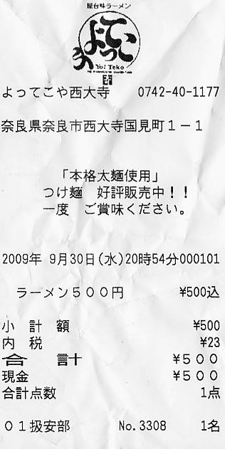 今日は雨。最近、近鉄奈良線の大和西大寺駅とその周辺では再開発が進んでいる。南口に通ずる道路工事も進み、改札内にも店が増えたが、一方では閉店する店もある。下のレシートは今日でお別れのよってこやのレシートだ。よってこやのコラム(www.yottekoya.com/column/)には