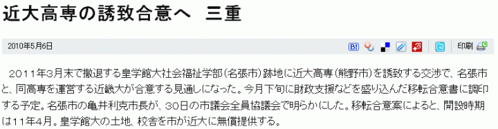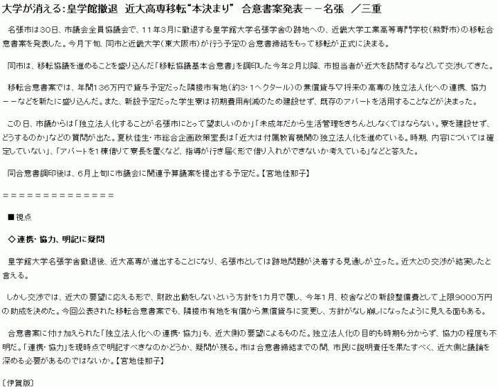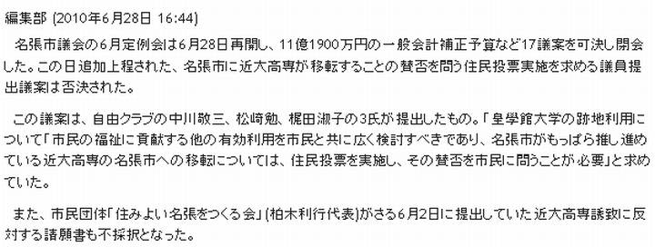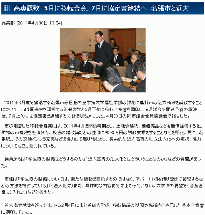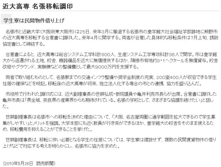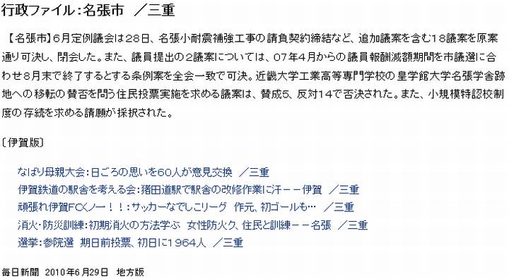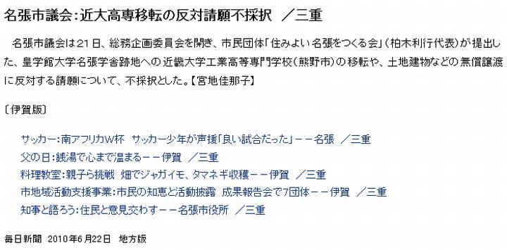 第1の話題:順に毎日 6/22 (mainichi.jp/area/mie/news/20100622ddlk24010332000c.html)·毎日 6/28 (mainichi.jp/area/mie/news/20100629ddlk24010354000c.html)·伊賀タウン情報YOU 6/28 (www.iga-younet.co.jp/news1/2010/06/post-512.html)の記事。毎日の6/22の記事は、名張市に於ける近大高専誘致に対して市民団体が出していた反対請願を市議会が否決したとある。その次、6/28の記事は近大高専誘致に関する住民投票案を否決した事に触れている。 伊賀タウン情報YOUはその両方を報じている。いよいよ、移転が本格化しそうだ。