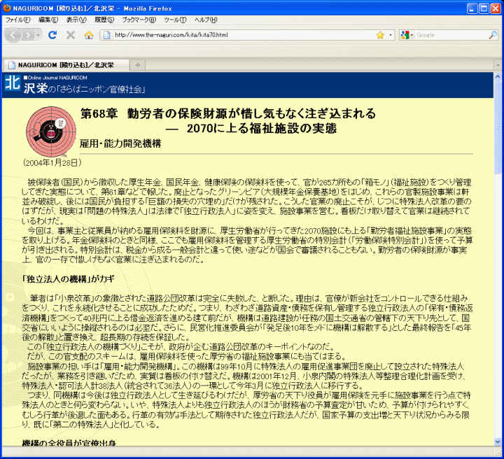 今日は晴時々曇。私のしごと館は、今では廃止されている雇用保険法第64条の雇用福祉事業の一環ならば、まだしもその条文と矛盾する事なく文化施設として解釈出来るのではないか、これは筆者が4/20に述べた感想である。従って、実際、私のしごと館は検討段階にあっては雇用福祉施設と見做されていたが、雇用福祉施設の建設に対する風当たりが強くなって来た頃から解釈を変え、能力開発施設として突き進んだのではいか。これを裏付ける証言がネット上にある。それは下の図、北沢栄の「さらばニッポン官僚社会」第68章(www.the-naguri.com/kita/kita70.html)。