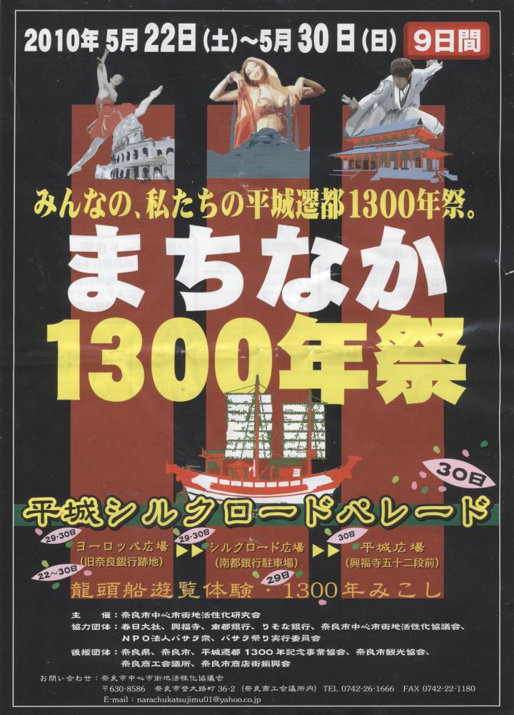 第2の話題:下は"まちなか1300年祭"のパンフレット。奈良市の中心部の商店街が企画したイベント。結局、行かなかったが、記念の為挙げる。開催期日は22日から30日迄だが、クライマックスとなる29·30日には三条通りでパレードが行われた模様である。