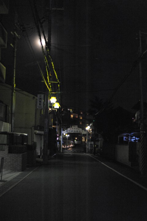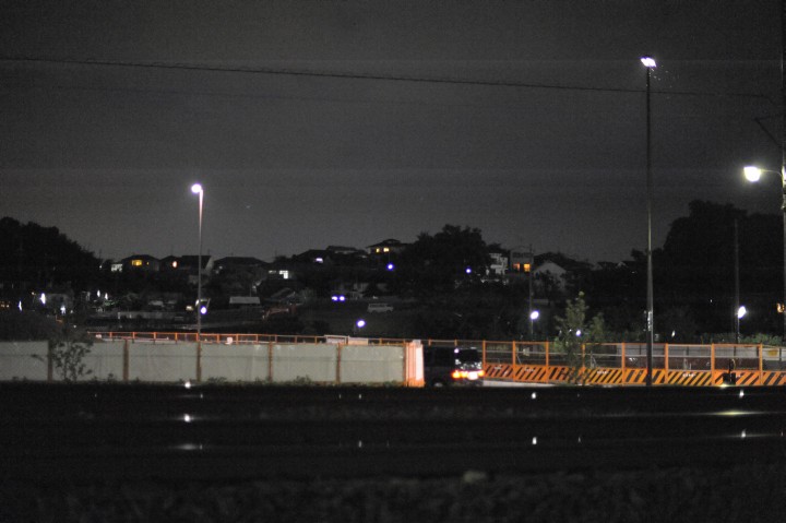 今日は晴だが、一時激しいにわか雨。D700購入の動機はライトアップ系の祭の撮影だった為、予行演習として雨が上がった後、近所をぶらぶらしつつ、夜景撮影を行った。勿論、手持ちである。感度は12800。レンズは50/1.4G。RAW+JPEG(L FINE)。光源を通過する様な帯が長辺方向に走っている。やれやれ。ライトアップ系の祭では、漆黒の背景に光源が点在する状況が多いのに、困った事である。