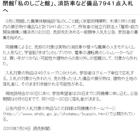 しかし起工は遅く2000年3月であり、その間の6年が計画に費やされている。この頃の面積は実際の私のしごと館の約2倍である。 また2002年には工事中でありながら、「学術研究サポートセンター」併設に関する提案がなされている。 とすれば、使う事が主目的となる補正予算の性格上、緊急措置としてとりあえず土地を購入したが、着工が遅かったのは建設に使える予算が無くなった為ではないだろうか。しかも土地代は150億円、最近の更地鑑定価格の4倍である。私のしごと館の様な公共文化施設を誘致する場合、土地を無償貸与する等大胆な資金面での優遇策が実施される場合もあるが、そうならなかったのは京都府都市開発公社も補正予算の性格を心得ていて、高値で売ったほうが労働省の顔も立つと認識していたのでは、と想像出来る。 それから、私のしごと館は一旦、67600m2の施設として計画されながら、出来た時には35000m2に縮小されている。そして繰り返しになるが、プレオープンと同じ年度に「学術研究サポートセンター」併設に関する提案がなされている。ここから、充分な検討を行う事なく慌てて土地を買ってしまい、その面積に合う施設を検討したが、内容に対し過大になってしまう問題はどうしても拭えず、縮小し、それでもなお職業体験以外の機能も併設しないと使い切れない事が最初から分かっていたのではないか、と想像出来る。 結局、私のしごと館は本当に必要だからと云うよりも、ケインズ的な発想の元で出来た施設ではなかろうか。経緯を見るとそうならざるを得ない。 | ||