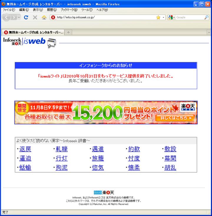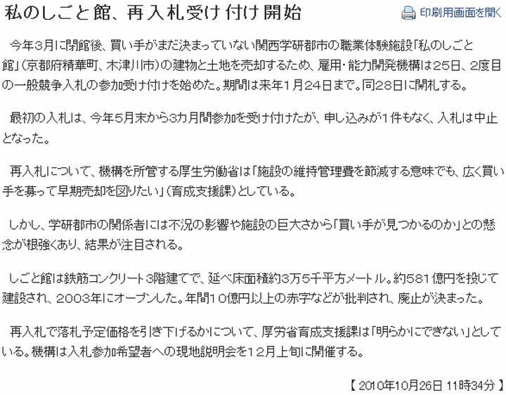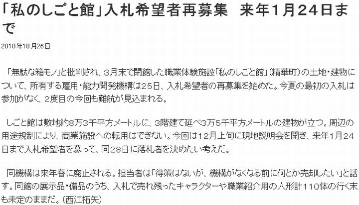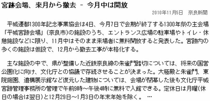 今日は曇。雑多な話題を挙げよう。探探館(インフォシークの無料webに置いていたこの日記の別名)が10/31を以って消失。(1)にその様子を挙げるが、どうやら8/25からアナウンスがあった模様。ずっと気付かなかった。ブログブームで単なるwebサーバーはもう下火なのだろうか。Cool Online(i.cool.ne.jp/murasakifox/)かGeocities(www.geocities.jp/murasakifox/)もあるから何とかはなるが、引越しはやはり大変である。 次は(2)京都新聞。けいはんなプラザの日時計のレーザー光線照射を復活させるべく、10/26に会合があった事を報じている。既に2度、テストがあった模様。筆者は長年、けいはんな地区に通勤していた。「14年ぶり」という表現から1996年迄は照射されていた様であり、筆者がいた頃とも重なっているが、全く知らなかった。けいはんな地区は研究機関を集積させた関西の筑波であるが、専門分野の点からはどうも縁遠く、よって本件に限らず知らない事が多い。 それから私のしごと館。(2)京都新聞と(3)朝日新聞が2度目の入札に触れている。10/25にも取り上げたが、最低落札価格をどうするか、厚労省育成支援課は明らかに出来ないとしている事、人形110体が売れ残っている事が追加情報だ。 最後は平城遷都1300年祭関連の話題を幾つか奈良新聞から。(5)11/7には平城遷都1300年祭の中心的なイベントである遷都祭がフィナーレを迎えるが、有終の美を飾るファイナルイベント「平城京カーニバル」の概要が明らかになった模様。要点をまとめると、
