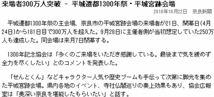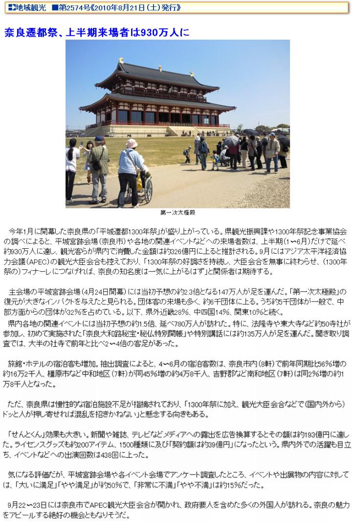 今日は晴。この日記だが、取り敢えずi.cool.ne.jp/murasakifox/に置く事とした。さて、平城遷都1300年祭は平城宮跡会場で250万人、全県レベルで1200〜1300万人の来場者を目標とするイベントである。前者に関しては目標をクリアした事に触れたが、後者の立ち上がりも好調で、上半期に於いて930万人に達した、と(1)観光経済新聞にはある。わざわざ報じているのだから、好評だったのだろう。