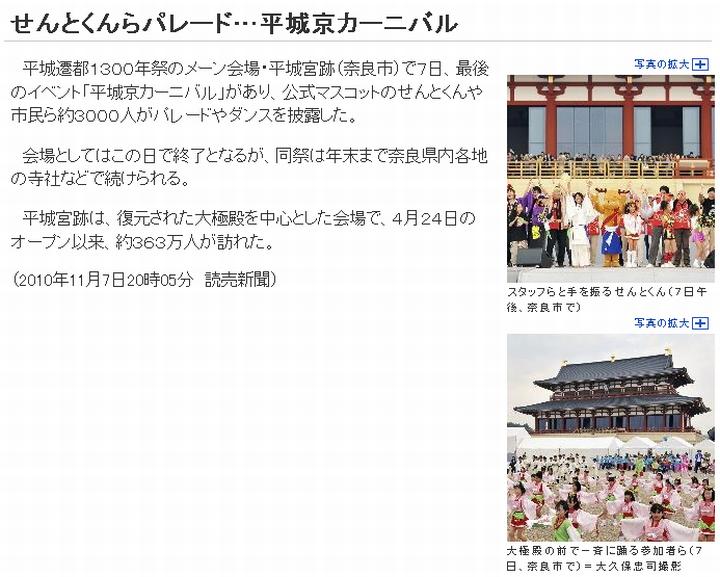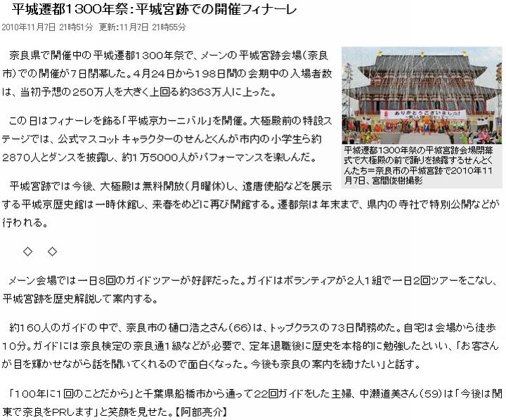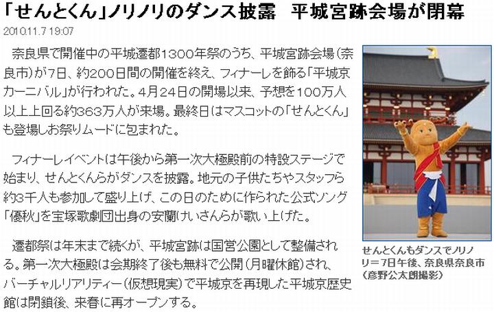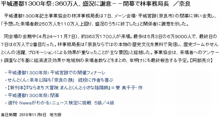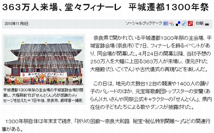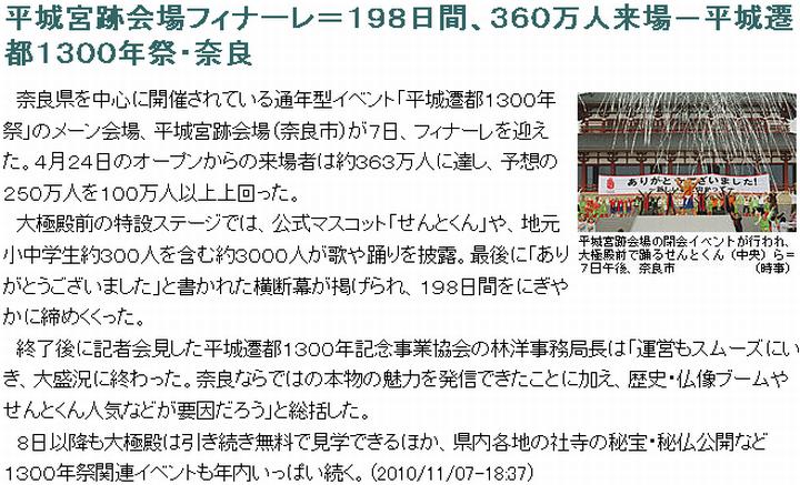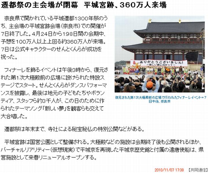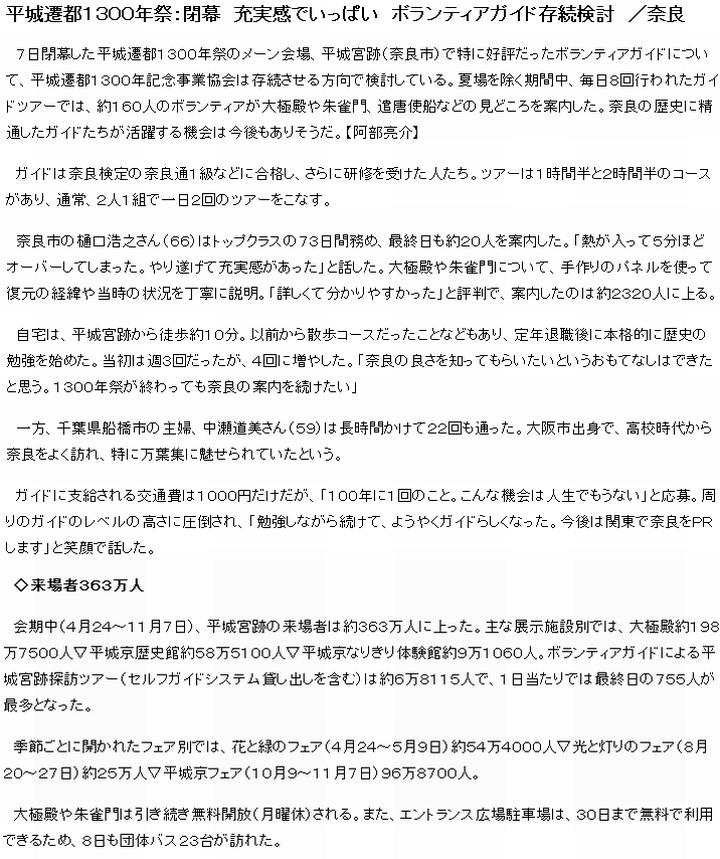 今日は曇。平城遷都1300年祭の主会場で約半年、開催されていた遷都祭が7日、終了。(1)から(7)の各紙が報じている。出ている話を総合すると、