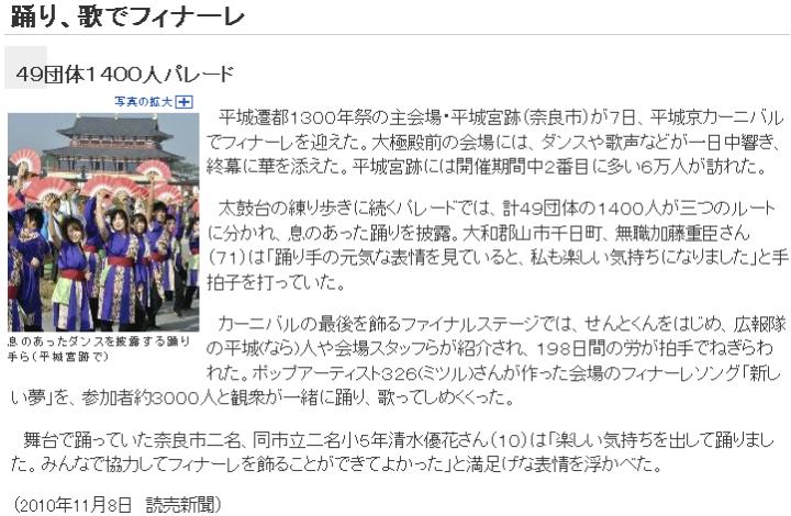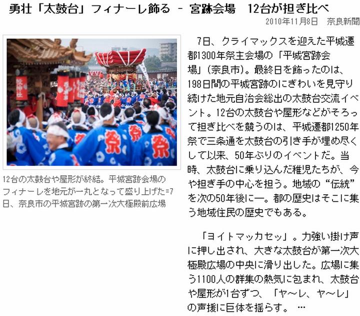 今日も昨日に似て曇。遷都祭最終日の続報が入っている。奈良新聞は地元紙らしく他紙に比べ詳細志向であり、(1)7日午前には太鼓台が集まった事に触れている。1250年祭では三条通を練り歩いたとか。ともかくこうした太鼓台は見て回ろうとすると何年もかかるから(通常、担ぎ出されるのは体育の日前後のみ)、集結型のイベントは見逃さない様にしたい。(2)最終日の様子全般に触れた記事も、この太鼓台を取り上げている他、平城遷都1300年祭はこれで終わりではなく、12/5には鴻ノ池陸上競技場を発着点とするマラソン大会がある事を述べている。一方、(3)読売は観客や舞台で踊った小学生の感想を載せている。(4)朝日は今後の行事として"祈りの回廊〜奈良大和路 秘宝・秘仏特別開帳〜"がまだまだ続く事に触れている。 ここまでは最終日の様子。最後に取り上げる(5)毎日は閉幕後の平城遷都1300年記念事業協会の林洋事務局長の声「予想した来場者数250万人を110万人上回り、盛況のうちに終了した」や、今後の事業報告に関して触れている。 ![]() (1)奈良(www.nara-np.co.jp/20101108120304.html) ![]() (2)奈良(www.nara-np.co.jp/20101108113748.html) ![]() (3)読売(www.yomiuri.co.jp/e-japan/nara/news/20101108-OYT8T00089.htm) ![]() (4)朝日(www.asahi.com/kansai/travel/news/OSK201011080005.html) ![]() (5)毎日(mainichi.jp/area/nara/news/20101108ddlk29040361000c.html) | ||