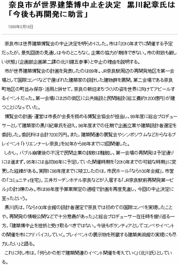 今日は晴。遷都祭終了後の動向と幻の世界建築博、この2つの話題を取り上げる。 先ず前者から。毎日は、(1)平城遷都1300年記念事業協会が、ボランティアガイドの存続を検討していると報じている。ボランティアガイドの制度は以前からあったが、今回特に好評で、平城宮跡の観光の場としての振興に不可欠と判断したのだろう。期間中の来場者363万人の内、大極殿を訪れたのは198万7500人、平城京歴史館58万5100人、平城京なりきり体験館9万1060人、ボランティアガイドによる平城宮跡探訪ツアー(セルフガイドシステム貸し出しを含む)は6万8115人。この7万弱の数値が多いかどうかだが、1回当たりでは観光バス1台分の人数になるので、協会は存続すべき、と判断したのだろう。 この平城宮跡、元々広場の様な所であったから、遷都祭終了後も開放されているのみならず、施設の一部も未だ利用可能で、8日も観光バスが訪れた、とある。この点に詳しいのが奈良新聞で、(2)エントランス広場の駐車場やトイレ、休憩施設等は11月中迄利用可能で、12月から撤去工事開始。近鉄奈良線の朱雀門踏切は存置。大極殿と朱雀門、東院庭園、遺構展示館等復元した建物は、文化庁の管理の元で無料で入館可能。また、(3)遷都祭に合わせて整備した西大寺駅南口広場の土地区画整理事業も再開される。 次に後者、建築博。筆者が奈良市に引っ越したのは2000年であり、それ以前の動向は知らないが、かつて奈良市では世界建築博の開催が検討されており、不況の影響で1999年、中止となった事を(4)日経が報じている。この建築博、