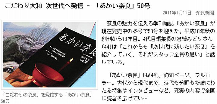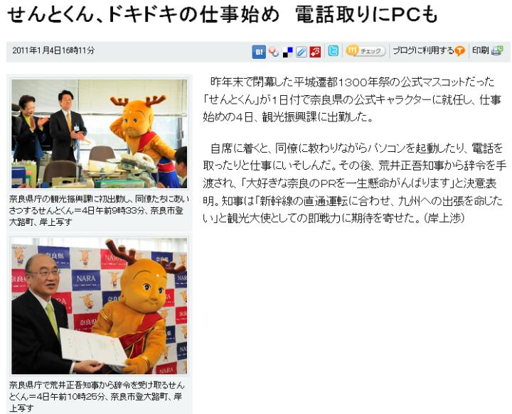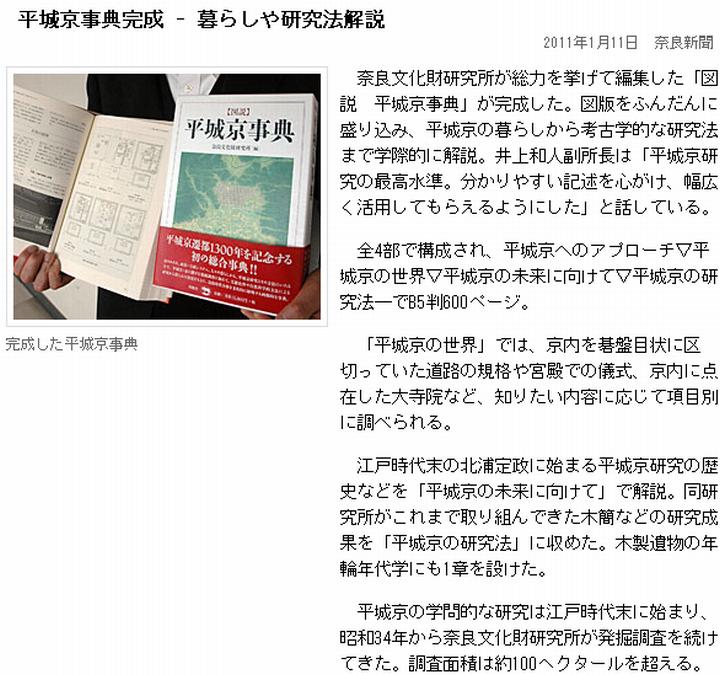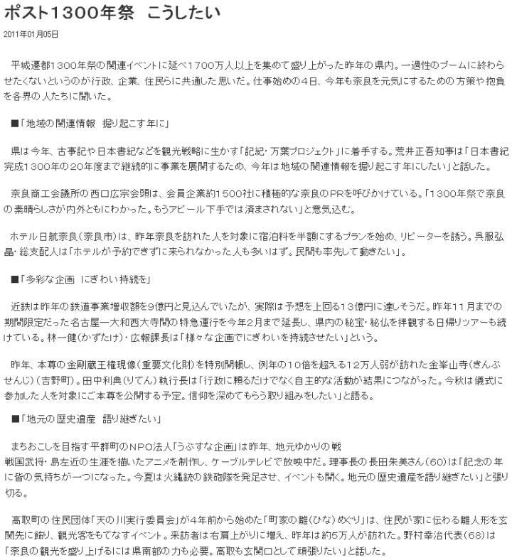 ![]() (1)朝日(www.asahi.com/national/update/0104/OSK201101040050.html) ![]() (2)朝日(mytown.asahi.com/nara/news.php?k_id=30000001101050001) ![]() (3)毎日(mainichi.jp/area/nara/news/20110101ddlk29040218000c.html) ![]() (4)京都(www.kyoto-np.co.jp/top/article/20110103000023) | |||||||||||||||||||||||||||||||||||||||||||||||||||