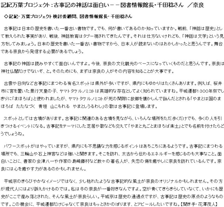 今日は曇後雨。1300年祭後に向けた動きが始まった。先ず(1)朝日は、奈良県の公式マスコットとして採用されたせんとくんが、仕事始めの4日、観光振興課に出勤した事を報じている。知事によれば九州に出向き、奈良県をPRする模様である。それからまた(2)朝日だが、1300年祭後の各論。記紀·万葉プロジェクト立ち上げや特別開帳を始めとするイベントの継続等がその中身である。1300年祭が成功と見做されているのは「平城遷都1300年祭」と云うキーワードの元で奈良県全域で各地のイベントを盛り上げた為である。賑わいの持続の為には、何か旗柱が必要ではなかろうか。そして(3)毎日。記紀·万葉プロジェクトの柱となる古事記の、図書情報館長·千田稔による解説である。古事記の舞台は奈良県内にも多く、