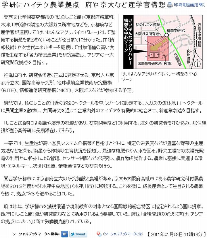 最後は話題を変え、奈良県に隣接するけいはんな地区の動向に触れる。(4)京都新聞によれば、「私のしごと館」跡や隣接する大阪ガス所有地等を、京都府が「けいはんなアグリバイオバレー」として整備する事を構想中である。 けいはんな地区と農学の縁は深い。 今、既に京都府大の農場があり、最近花空間けいはんなを接収して拡張されたが、そればかりではない。 京大の農場も高槻市から移転する計画も決まっているが、けいはんな地区開発のそもそものきっかけは関西学術研究都市調査懇談会の座長を務めた奥田東元京大学長が、留学生向けの農場を作りたいと思った為でもあった。 これだけが理由ではないだろうが、ともかくけいはんな地区で盛んな研究分野の1つは農業である。さてけいはんなアグリバイオバレー構想の中身だが、