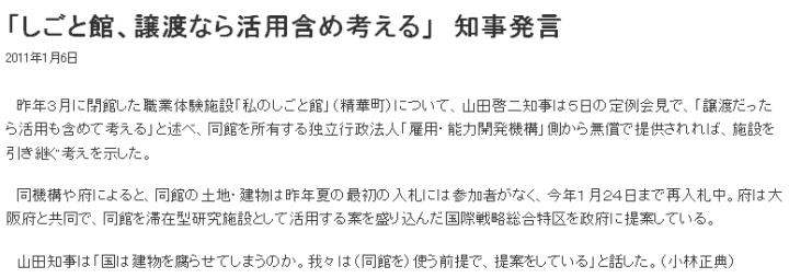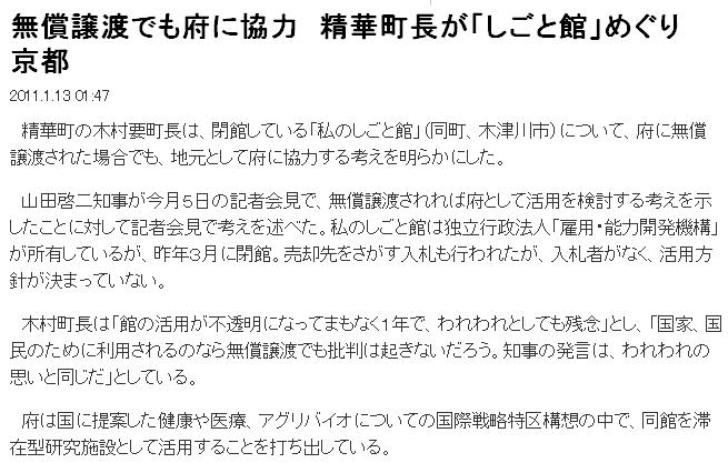 である。「なぜ日本の若者は自立できないのか」は、人間の情報処理の在り方として視覚空間型·聴覚言語型·視覚言語型の3つを挙げ、日本の教育は特に視覚空間型の若者に向かないが故に、その自立を妨げていると説く。視覚空間型の人はじっくり考える事は苦手で問題児扱いされ易いが、実技には強く、職人や芸術家、スポーツ選手等に向いている。聴覚言語型の人はコミュニケーション能力に優れ、場の空気を読み、共感的で、奉仕したり、相談に乗ったり、交渉したりする仕事に向く。従って論理的、抽象的な話題は苦手と云う欠点もあるが、概ね日本の教育システムに於いては困難は感じない。視覚言語型の人は聴覚言語型の人と違って論理的、抽象的な思考に強く、学者や研究者に多い他、法律や会計の分野にも適するが、社会的スキルに難がある。 この分類方法、H. Gardnerの7つの知能説(言語的·論理数学的·空間的·音楽的·身体運動的·社会的·内省的)を簡略化しただけにも見えるが、図4との関連を考えるならば、視覚空間型·聴覚言語型·視覚言語型の人柄がまさにα·β·γに相当するのではないだろうか。何故そうなのか、気が向けば述べるかもしれない。 第2の話題:産経によれば、精華町の木村要町長は、閉館している「私のしごと館」について、京都府に無償譲渡された場合でも、地元として府に協力する考えを明らかにした、とある。京都府が「けいはんなアグリバイオバレー」構想をまとめていて、その中で私のしごと館の活用にも触れている事は5日に、無償譲渡されれば活用を考える事は10日に触れたばかりだが、「地元として府に協力する」とは具体的に何をするのだろうか。公的な研究機関として活用する場合、税を減免する措置かもしれない。私のしごと館も現役の頃には、公的な文化施設として税の面での優遇措置を受けていたからである。 ![]() 産経(sankei.jp.msn.com/region/news/110113/kyt11011301500010-n1.htm) | |||||||||||||||||||||||||||||||||||||||||||||||||||