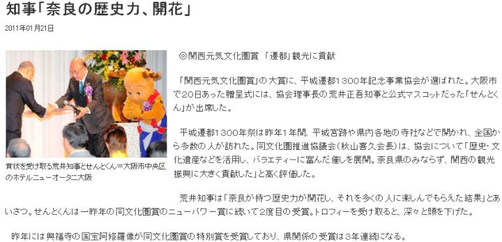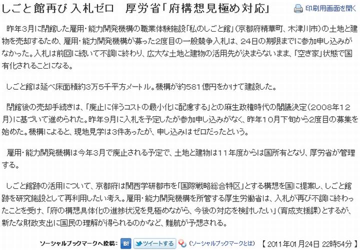 今日は晴。先ず平城遷都1300年祭の話題。(1)朝日の報じる処によれば、平城遷都1300年記念事業協会が「関西元気文化圏賞」の2010年の大賞を受賞したとある。2008年のせんとくん、2009年の国宝阿修羅像(興福寺)に続き、奈良県としては3年連続。「関西元気文化圏賞」は文化に限らず、鉄道開通の様な関西の話題全般を対象としている様子だが、それだけに平城遷都1300年祭が成功と見做されている姿がうかがえる。この種の地域イベントにも勝ち組と負け組があり、前年の例えば横浜開港博は失敗とされている。これに対し、身の丈に合った企画を行い、既存の文化遺産を活用し、ここまで盛り上げた事を表彰する、と云う意味だろうか。 続いて私のしごと館。(2)京都新聞によれば、私のしごと館の2度目の入札に対し、応札者は現れなかった、とある。私のしごと館の西側にも広大な更地が広がったままだが、何も建つ気配がなく、時折イベントの際の臨時駐車場として利用されているから、今回の結果も不思議ではない。跡地の活用、となると三重県名張市の皇學館大学が撤退と同時に4月から近大高専に衣替えする事になっているが、これはうまく行った例。逆に20年近く空き家のままの、野村総研跡地(鎌倉市)の様な事例もある。京都新聞は、京都府の国際戦略総合特区構想の進捗を見極めながら対応したいとの厚生労働省の見解で結んでいる。しかし国際戦略総合特区構想では私のしごと館は宿泊可能な研究施設、けいはんなアグリバイオバレー構想では宿泊機能のない展示·会議場として活用する事になっているので、違いが整理されていない点ではまだ何も決まっていないのに等しい。その上、京都府は私のしごと館が無償ならば受け取る用意があると発言しているが、本当はけいはんなプラザへの梃入れで手一杯ではなかろうか。従って、私のしごと館の前途は厳しい。 最後、22日には若草山の山焼きがあった。(3)早速家の近くの眺望の良い場所で撮影。しかしカメラの設定を誤って暗い写真になった上、微妙にブレてしまった。電子ケーブルレリーズを使ったにも関わらず。(4)翌日の黒焦げ写真でも、載せるか。 ![]() (1)朝日(mytown.asahi.com/nara/news.php?k_id=30000001101210001) ![]() (2)京都新聞(www.kyoto-np.co.jp/politics/article/20110124000168) ![]() (3)若草山の山焼き当日 ![]() (4)若草山の山焼き翌日 | ||