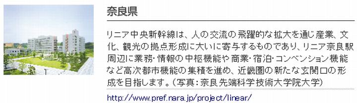 となると京都府がやっぱり府内に駅を作れ、と騒ぎ出すかもしれない。 木津川市も精華町も、走っているバスは奈良交通で、地形的にも奈良市の一部の様な場所。けいはんなプラザに入居している銀行も京都銀行ではなく南都銀行だ。この様な地域に中間駅ができたとなると、距離的にメリットを享受できるのは寧ろ奈良県である。従って奈良県も、奈良市周辺とは県内だと管を巻きつつ、木津川市·精華町ならば妥協する用意があるのかもしれない。中間駅建設の負担もなくなる。 ![]() (1)産経(www.sankei-kansai.com/2010/12/18/20101218-047462.php) ![]() (2)リニア中央新幹線建設促進期成同盟会(www.linear-chuo-shinkansen-cpf.gr.jp/tiiki.html) | ||