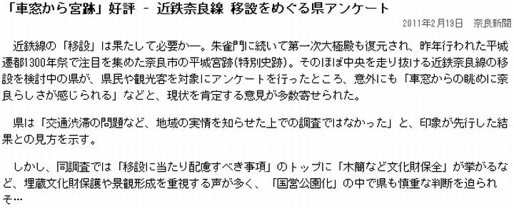 今日は晴。昨日は平城宮跡を通過する近鉄奈良線の移設に触れたが、(1)読売は更に詳しく報じている。要点は以下の通り。先ず結果だが、