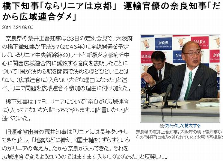 今日は雨後曇。産経(1)によれば、橋下知事(大阪)がリニア新幹線の中間駅を関西広域連合内(京都府内)に誘致する意向を表明したが、これに荒井知事(奈良)が反発していて、「広域連合にますます入りたくなくなった」と発言している。リニア新幹線の名古屋·大阪間の中間駅は奈良市付近に出来る、とされている。だが奈良市は奈良県の北端にあり、ほんの数km北向かうとそこはもう京都府である。例えば写真(2)は菖蒲池付近で撮影したが、少しだけ見える茶色のビルはけいはんなプラザで、場所は北隣の精華町光台。精華町、木津川市は行政上は京都府に属しているが、地形的には寧ろ奈良県の一部の様な処である。従って京都市内はあり得ないとしても、けいはんな地区ならば奈良県は名を捨てて実を取った事になるのではないか。