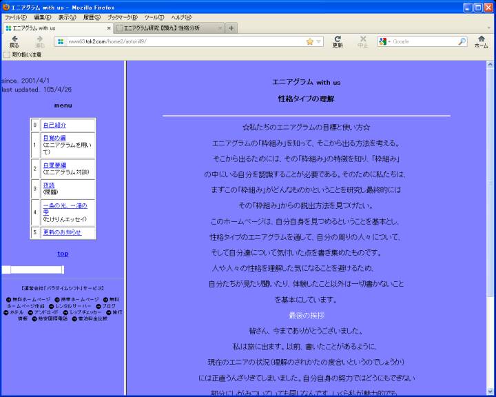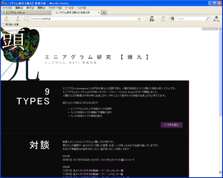 今日は晴だが冬らしく、雲が漂い小雨も降った。昨年12/30には久々に心理学の話題に触れたので、今日もその1つ、エニアグラム(enneagram)を取り上げる。エニアグラムとはダイヤモンドのカットを連想させる丸い図形[1]で、現代では人間の性格を9通りに分類する体系として知られている。さてエニアグラムを個人の資格で考察·紹介するサイトとしてエニアグラム with us[2]があった。現在も存在はするが、2005年以降休止状態。一方、やはりそうしたサイトの1つ、エニアグラム研究【頭九】[3]は2009年頃に誕生した様子で、MBTIへの言及もあり、これからの充実が楽しみである。 ところでこの2つを取り上げた理由だが、休止中の前者を後者が継承している疑いを抱いている為だ。即ち