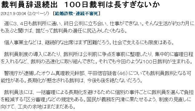 今日は晴。産経[1,2]によれば、埼玉県で起きた連続不審死事件の裁判が100日を要する見込みで、裁判員候補者の中から多数の辞退者が出た模様。1年の1/3近くを拘束される生活が始まるのだから、当然だ。それにしても、