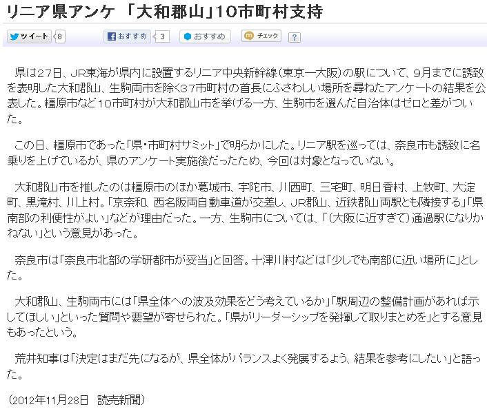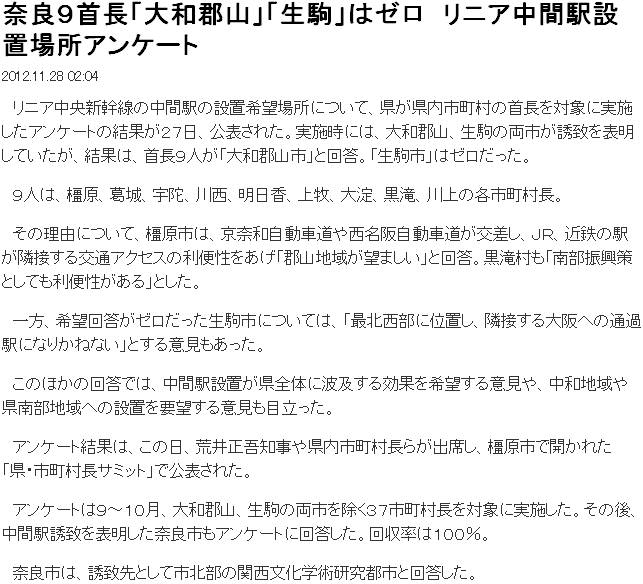 今日は曇後晴。10/18に、奈良県が、県内の市町村に対し、リニア新幹線の中間駅に関するアンケートを行った事に触れた。産経[1]·読売[2]·毎日[3]によれば、結果が公表された模様。産経[1]は、橿原、葛城、宇陀、川西、明日香、上牧、大淀、黒滝、川上の9市町村が大和郡山市を支持する一方、生駒市への支持は0としている。筆者は、生駒市に隣接する自治体からは賛意が来るかもしれないと思っていたが、結果は大きな差だ。ところが読売[2]は、大和郡山市を支持したのは三宅町を加えた10市町村としている。そこで毎日[3]を当たってみると、