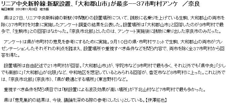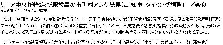 今日は晴時々曇。奈良県が県内の市町村に対し実施したリニア新幹線の中間駅に関するアンケート結果については12/3に触れた。その中、毎日は知事の発言を