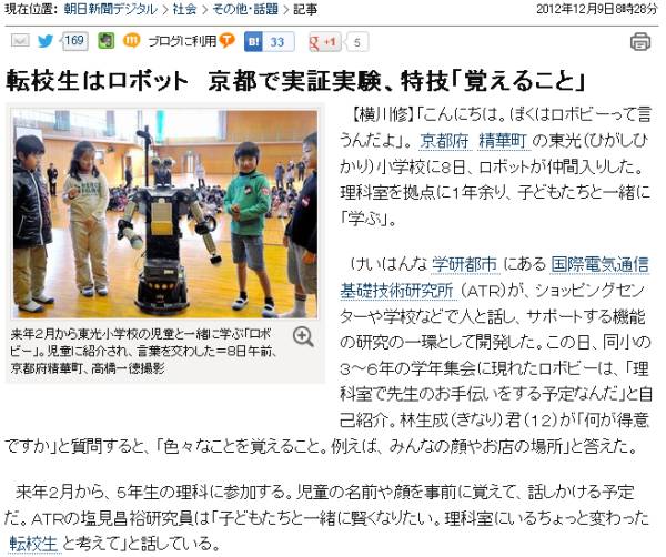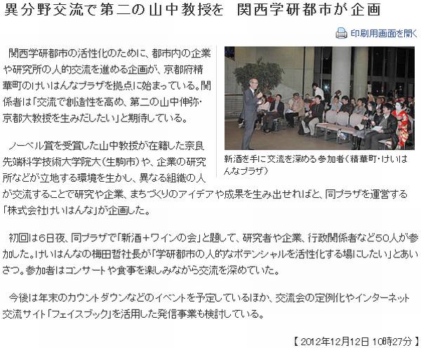 今日は曇後、夜中には雨。けいはんな学研都市の動向に触れる。先ず朝日[1]によると、精華町の東光小学校にロボットがやって来た模様。特技は覚える事で、理科室で教員の手伝いを行う予定。けいはんな学研都市は新興ベッドタウンではあるが、ロボット等の実証実験が進められている処はやはり科学の街だ。 続いて京都新聞[2]によると、(株)けいはんなが、関西学研都市の活性化のために、都市内の企業や研究所の人的交流を進める企画を実施した模様。第1回は新酒+ワインの会。実はこうした地域交流の企画、筆者が通っていた往時のほうがまだしも盛んだった気がする。例えば「間」(ま)という概念に関して自由に語り合い、その結果を古典芸能や居合いといった形で発表した人もいた。だが、(株)けいはんなは倒産。再出発後は主として映画、舞台の様なエンターテイメント系のイベント開催に特化しており、研究·ビジネス系のイベントは(財)関西文化学術年推進機構の手に移った様子だが、また風向きが変わって来たのだろうか。 またまた京都新聞[3]だが、けいはんな学研都市が国の関西イノベーション国際戦略総合特区の地域指定を受けて1年、規制の特例措置や税の軽減などの利点があり、進出や設備増強を進める企業が出始めている、とある。主としてけいはんなプラザよりも北側の一帯では以前から、研究機能と生産機能が1つになった研究開発型産業施設の進出を許しており、今ではかなり埋まっている。筆者が撤収した頃は雑木林だったのだが。学研都市も、特区指定により、どんどん変わって行くに違いない。 ![]() [1]朝日(www.asahi.com/national/update/1208/OSK201212080020.html) ![]() [2]京都新聞(www.kyoto-np.co.jp/local/article/20121212000033) ![]() [3]京都新聞(www.kyoto-np.co.jp/economy/article/20121208000033) | ||
