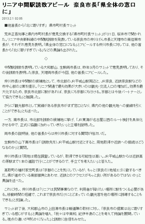 今日は晴。第1の話題:ADSL開通を確認。「8日の翌営業日」とあるので12日と思っていたが、試しに繋ぐと開通していた事が判明。 第2の話題:産経[1]には、31日、県知事と市町村長が意見交換を行う「県市町村長サミット」が開催され、リニア新幹線の駅を巡って、奈良市の仲川げん市長と天理市の南佳策市長が意見を表明した、とある。仲川市長の提案は、北端の平城山駅付近と市中心部のJR·近鉄奈良駅付近。これまで学研都市が望ましい様な発言をしていた仲川市長だが、やっと具体的な候補地を挙げた。その理由として、