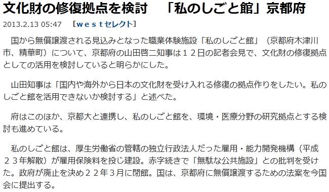 第3の話題:また産経[1]だが、無駄の象徴として批判を浴び、2010年3月に廃止された私のしごと館を国から京都府に無償譲渡する為の法案が国会に提出される模様。筆者が感ずる疑問は2つ。先ず、研究拠点として活用される見通しだが、その目的でけいはんなプラザが既に存在する。このけいはんなプラザ、2007年12月に倒産し、その後京都府の施設として再出発している。となれば、その上に更に私のしごと館を背負うのは無理ではないのか。次に土地。私のしごと館の土地(約8万m2)は、京都府土地開発公社が国に約150億で売った土地である。従って、京都府は何もしないで150億をせしめた事になってしまうが、法的、信義的な問題はないのか。 ![]() [1]産経(sankei.jp.msn.com/region/news/130201/nar13020102050002-n1.htm) ![]() [2]産経(sankei.jp.msn.com/politics/news/130208/plc13020810260008-n1.htm) | ||