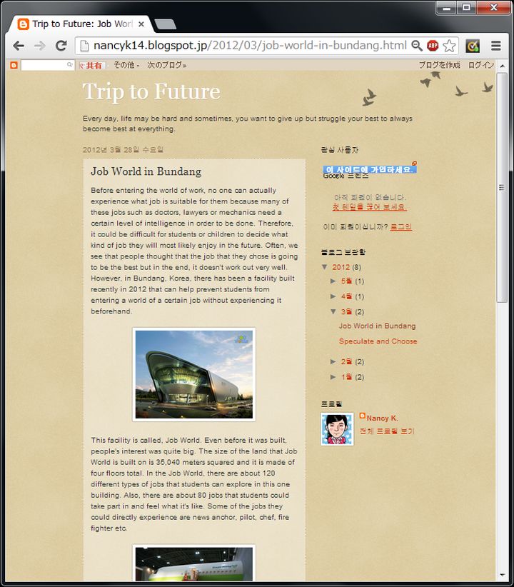 今日は晴。第1の話題:子供は3/17に幼稚園を卒園、半年間通った地元のサッカークラブ[1]の幼児コースも昨日で最後だった。 第2の話題:さて、昨年の同時期の日記を読み返すと、けいはんな学研都市の公式HPがガラッと変わったとか、躁鬱·分裂気がどうのこうのとか、書いた様子だ。その1年前は近所でやっていた蛍の幼虫の放流とか、奈良市に於いて平城京天平祭が始まった年に奇しくも世界建築博の中止が決まったとか、韓国が私のしごと館をパクった施設を建設しているとか、書いていた。そこで最後の話が今どうなったか、探ってみると、公式HP[2]が出来ている。韓国語オンリーでさっぱり分からない為、英語で記されている個人のブログ[3]を見ると、2012年に建設、とある。何年、存続出来るか見物だ。 ![]() [1]奈良伏見フットボールクラブ(nffc1986.web.fc2.com) ![]() [2]Korea Job World(koreajobworld.or.kr/Index.do) ![]() [3]Trip to Future(nancyk14.blogspot.jp/2012/03/job-world-in-bundang.html) | ||