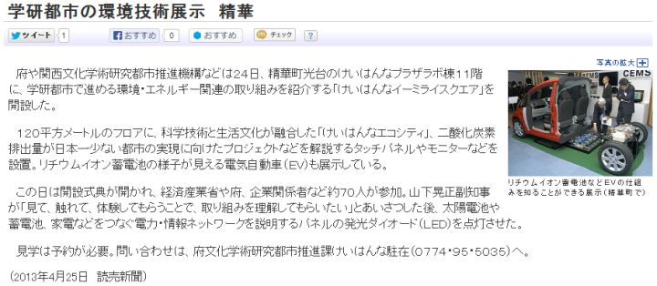 今日は曇時々晴。読売[1]の報ずる処によれば、京都府等が精華町のけいはんなプラザラボ棟11階に、学研都市で進める環境·エネルギー関連の取り組みを紹介する「けいはんなイーミライスクエア」を開設した模様。現在、経産省のプロジェクトとして進められているエコシティ実証研究の一環だろうが、展示事業であるならば、予約が必要、と云うのはハードルが高い印象を与える上、本来ならばラボ棟よりも近接する交流棟が相応しいのではないだろうか。