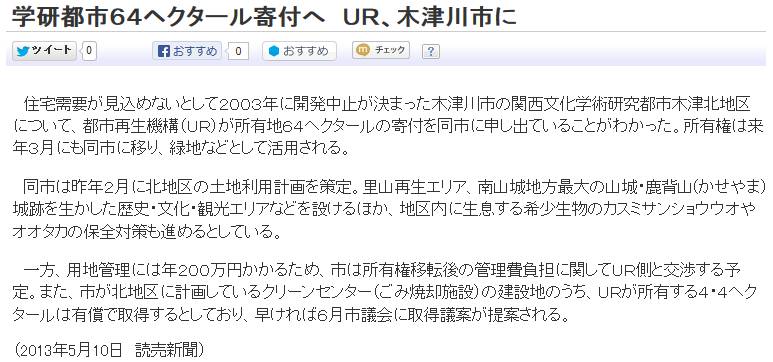 今日は晴。読売[1]の報ずる処によれば、木津北地区の土地64がURから木津川市に無償譲渡される、とある。しかしながらURは国に属する独立行政法人である。今、国有財産である私のしごと館とその土地を京都府に無償譲渡するに当たっては法的な障害があり、特区制度を活用したトンネル的なやり方が検討されている。而るにURから自治体への寄付に関しては特段の問題はない様子だ。国本体と、その子分とで、どうしてここまで無償譲渡のハードルが違うのか。