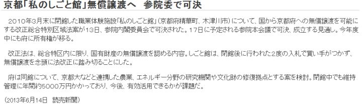 今日は晴。私のしごと館に動きがあった模様だ。読売[1]によれば、国から京都府への無償譲渡を可能にする改正総合特別区域法案が13日、参院内閣委員会で可決され、17日に予定される参院本会議で可決、成立する見通しとなった。同じ事を2度も[2]伝えている。使い道は農業·エネルギーの研究拠点や文化財の修復拠点とあるが、どうだろうか。けいはんな地区にはけいはんなプラザが貸しビル·会議場として存在しているが、稼働率は低く、2007年に経営破綻。その後、府が部分的に引き取る事で救済している。とすれば、私のしごと館はけいはんなプラザと明らかに競合する。府に競合を防ぐ妙案はあるのだろうか。