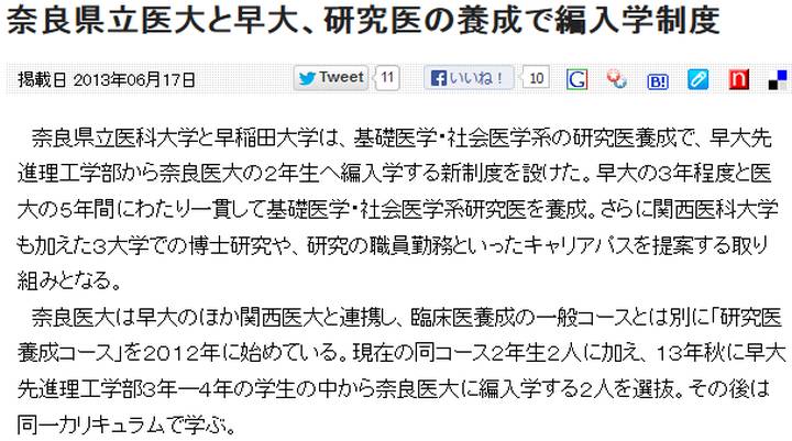 今日は曇後雨。慶応にあって早稲田にない物、それは医学部である。従って、早稲田は医学部を作りたがっている、と云う噂は以前からあり、それを見越して茨城県は医学部誘致活動を行っている。ところが日刊工業新聞[1]によれば、早稲田は奈良県立医大と提携し、編入学する新制度を設けた、とある。医学部の新設が難しい仲での裏技か。