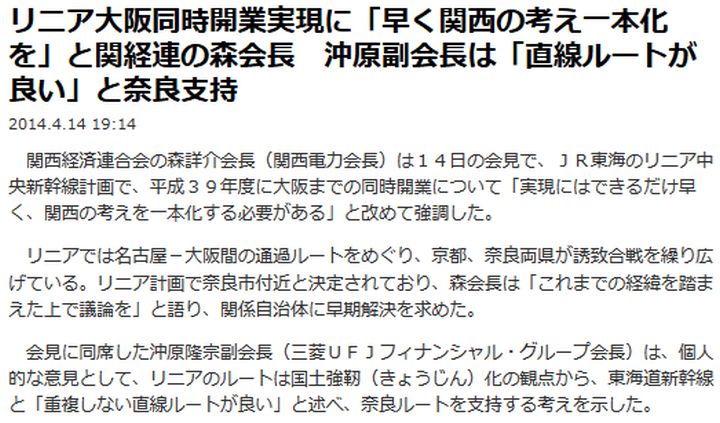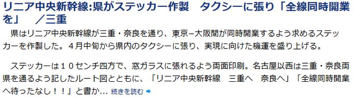 今日は晴後曇。リニア新幹線に関連した奈良の話題2つを挙げよう。先ず毎日[1]によれば、リニア中央新幹線が三重·奈良を通り、東京-大阪間が同時開業するよう求めるタクシー用ステッカーを奈良県が作製した、とある。続いて産経[2]によれば、関経連副会長が、奈良ルートを支持する考えを示した模様。さて、どうなる事やら。