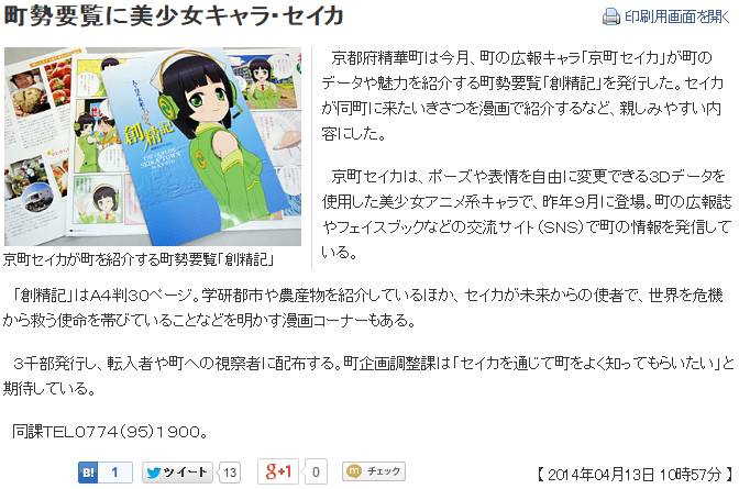 今日は晴。京都新聞[1]によれば、京都府精華町は今月、町の広報キャラ"京町セイカ"が町のデータや魅力を紹介する町勢要覧"創精記"を発行した模様。せんとくんや熊もんのような、実態ゆるきゃらは登場するのかな。