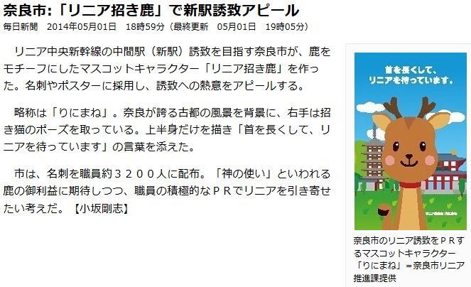 今日は晴。リニア中央新幹線を巡る奈良の動きを2つ。先ず毎日[1]によれば、奈良市が、鹿をモチーフにしたマスコットキャラクター「リニア招き鹿」を作った、との事。だが、奈良市のゆるキャラとしては既に「しかまろくん」が存在する上に、「りにまね」の「まね」も「真似」に聞こえてしまう。しかまろくん、せんとくんの1ポーズで充分だったのではないか。 続いて県の動向。産経[2]によれば、県知事は、リニア中間駅の候補地として立候補している3市に対し、「JR東海が環境影響評価を始めた段階でルートが絞られるため、自然に集約されていく可能性もある」との認識から、敢て調整は行わない模様。一本化すべきだ、とする意見もあるが、寧ろ至極尤も。奈良県は遺跡リスクの高い地域である上に、そもそも、リニア新幹線事業の実施者はJR東海であり、自治体ではない。であれば、自治体として、敢て場所の絞込みはせず、JR東海の希望に従う姿勢もあるべき誘致戦術の1つである。 ![]() [1](mainichi.jp/select/news/20140502k0000m040020000c.html) ![]() [2](sankei.jp.msn.com/region/news/140501/nar14050102100002-n1.htm) | ||