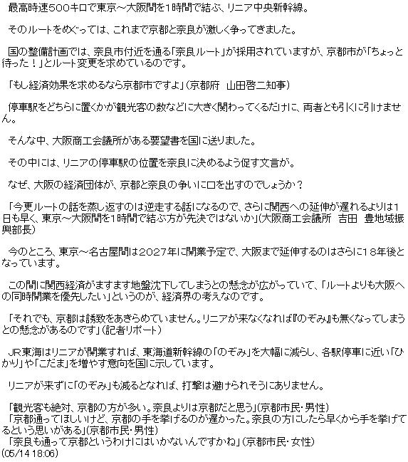 今日は雨後曇。毎日放送[1]によれば、リニアの停車駅の位置を奈良に決めるよう促す要望書を、大阪商工会議所が国に送った、とある。理由は、ルートの話を蒸し返すと、名古屋-大阪間の開通が遅れる為。今からルート変更となると、三重県·滋賀県も含む煩瑣な再調整が不可避となるから、この意見、至極もである。