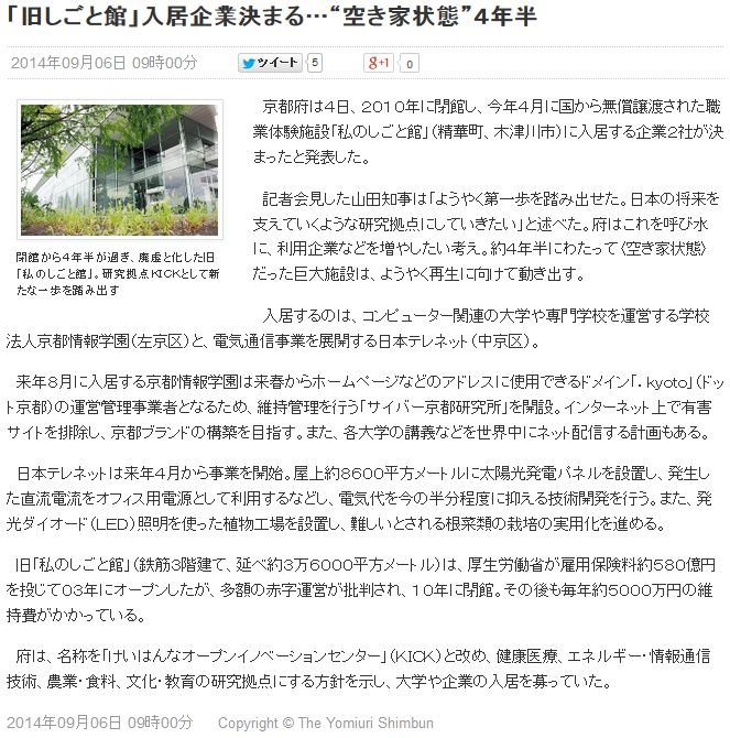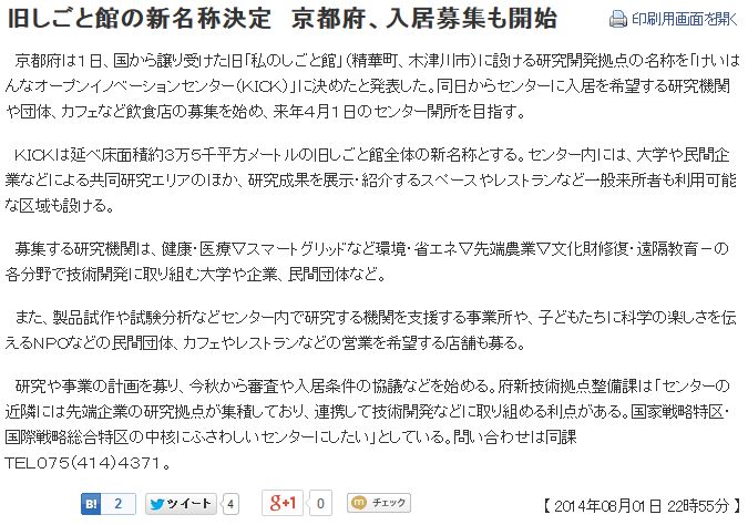 今日は晴。久し振りに日記を更新する。けいはんな関連の話題であるが、京都新聞[1]によれば、京都府は国から譲り受けた旧"私のしごと館"に設ける研究開発拠点の名称を"けいはんなオープンイノベーションセンター(KICK)"に決めたと発表した、とある。しかしどうだろう。研究機関を入居させる目的で建設·運営されている施設としてけいはんなプラザがある。このけいはんなプラザ、2007年に経営破綻し、その後京都府の支援も受け、何とか続いて来ている。となれば、KICKはけいはんなプラザと明らかに競合し、共倒れの可能性も高い。京都府は何を考えているのだろうか。