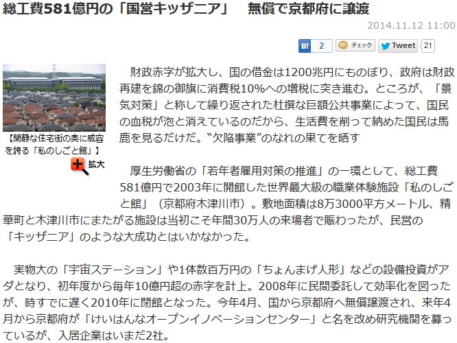 今日は曇。NEWSポストセブン[1]によれば、京都府に国から無償譲渡された私のしごと館改めKICKの入居企業は未だ2社との事である。研究所や企業を入居させる目的で建設されたけいはんなプラザも稼働率の低さで2007年末に倒産、その後京都府の一部支援を経て青息吐息で低空飛行を続けている。となれば、より巨大で貸しビルとしての用途を想定していない私のしごと館の有効活用は遥かに困難だった筈である。どうなる事やら。