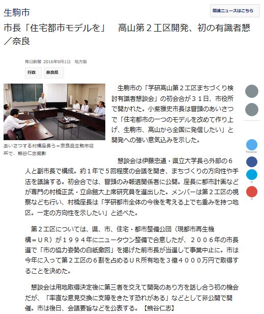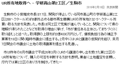 第2の話題:産経[3]によれば、高山第2工区の内、URが保有する160haの土地を生駒市が購入したい模様。URは2018年度迄に保有地を処分する予定であり、それに乗った形。だが取得したとしても有効活用出来るだろうか。 ![]() [1]https://www.scsk.jp/corp/csr/social_contribution/camp.html ![]() [2]同上 ![]() [3]sankei-nara-iga.jp/news/archives/5792 | ||