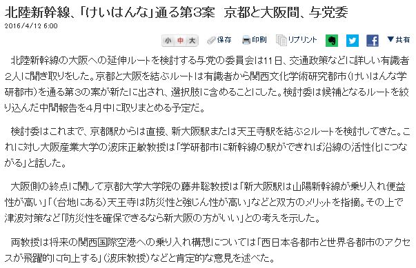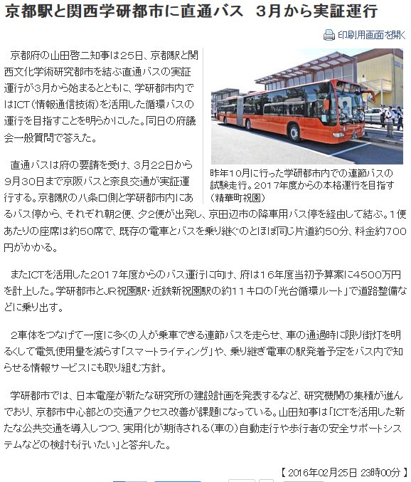 今日は曇時々雨で、夜には晴れた。第1の話題:京都新聞[1]によると、京都駅と関西文化学術研究都市を結ぶ直通バスの実証運行が3月から始まる模様。また、学研都市内ではICTを活用した循環バスの運行を目指す、とも報じられている。前者に関しては、既存の電車とバスを乗り継ぐのに比べ、どうメリットを出すかが事業としての成立の鍵になる。後者に関しても既存のバス網とどう違うのか、訴求力が問われる。それよりクラスター間、例えば奈良先端大とけいはんなプラザと関西光科学研を結ぶ様なコースがあれば便利だが。 第2の話題:毎日[2]によると、京都商工会議所の立石義雄会頭がリニア新幹線に関し、「京都駅にこだわらず、南部の学研都市などを経由するルートも含め幅広く要望したい」と発言したとある。学研都市は奈良市付近でもあるから、そこをルートとして挙げるのは自然な発想である。だがこの話はここで終わりではない。学研都市には官民の多くの研究施設があり、(公財)国際高等研究所もその1つである。この国際高研、基礎研究を重視する研究所でありながら、民間からも資本·人材を集めており、理事長は立石義雄である。従って、学研都市に有利な発言を行う素地はあったのである。 ![]() [1]www.kyoto-np.co.jp/politics/article/20160225000172 ![]() [2]mainichi.jp/articles/20160224/ddl/k26/020/535000c | ||