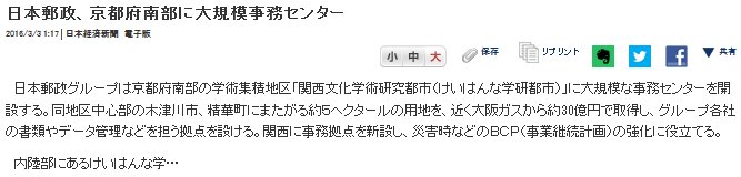 今日は曇時々晴。日経[1]によると、日本郵政がけいはんな精華·西木津地区に進出する模様。場所は大阪ガスの所有地で、5haを30億円で取得。昨年、やはり大阪ガスの所有地の内5haを三菱東京UFJ銀行した事は報じられたが、これでけいはんな精華·西木津地区の大きな区画は全て埋まってしまった。筆者は1996年1月から2007年3月迄、けいはんな精華·西木津地区に通勤していたが、当時の大ガス所有地はその隣の民間デベロッパーが開発した区画と併せ、全く施設が出来る気配がなかった。でも、もうこんな事も、思い出となった。